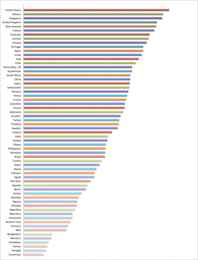 - 61 countries were measured, from the US to Cameroon. Where is Belgium?! It seems almost ludicrous that sufficient data would be available for a considerable number of developing countries, and not for Belgium, or that no Belgian experts could be found to fill out the survey. Does this mean that Belgium is not even a blip on the open data radar? Something to think about, I would say…